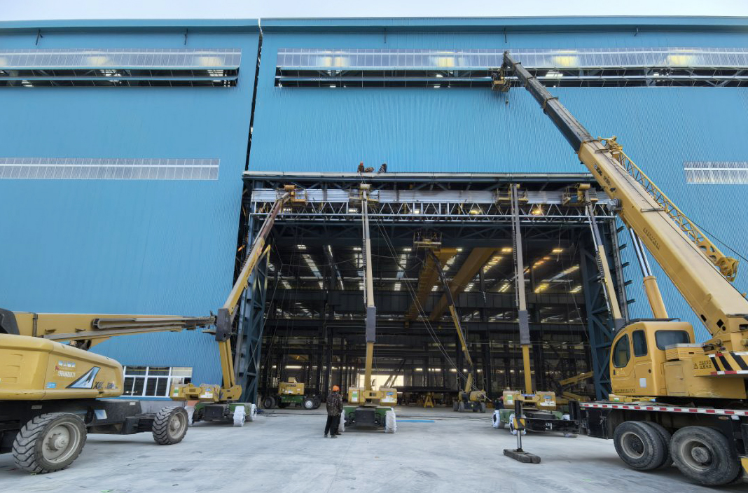 在恒力重工三期厂房建设工地,近10台30米级在线押球(中国)唯一官方网站高空作业平台正大显身手,忙碌于车间内外钢结构建设与墙面装饰等精细作业。