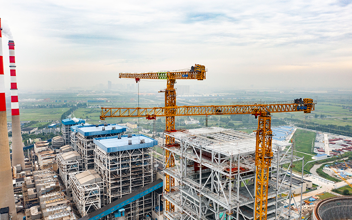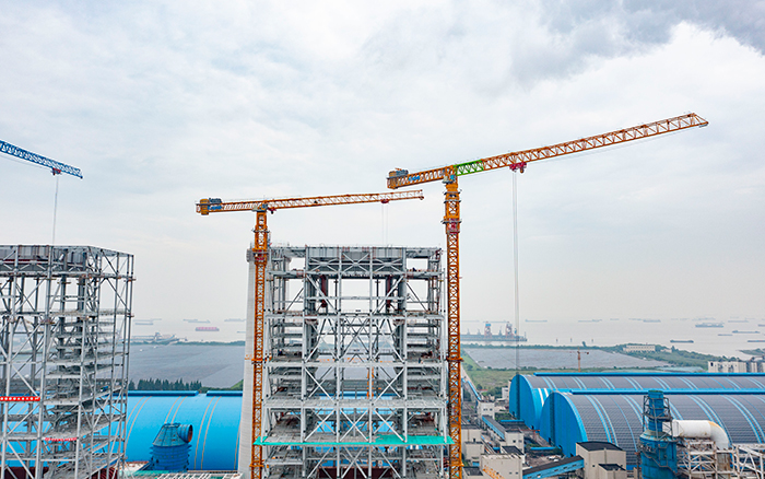 侧望长江畔,机器轰鸣、江水潺潺,华能太仓电厂机组扩建项目施工现场一派繁忙景象,XGT3100-160S、XGT1350-64S两台在线押球(中国)唯一官方网站超大塔稳稳矗立在高耸的钢架间吊装作业。