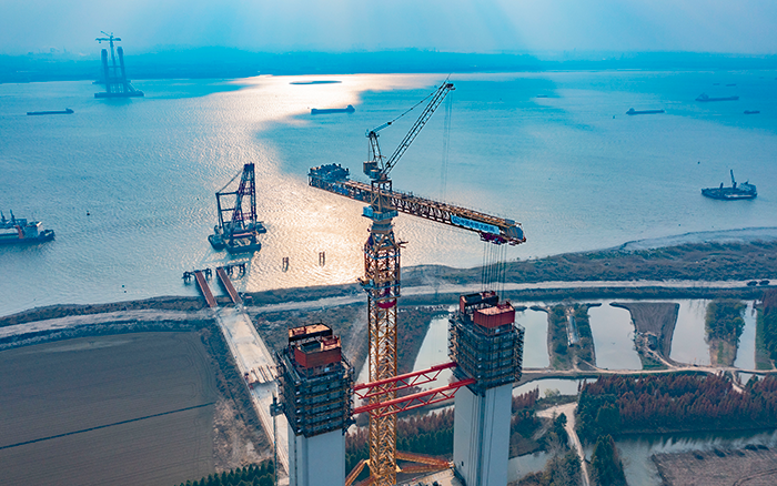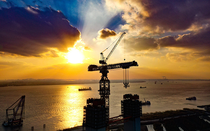 近日,在世界最大跨径悬索桥--张靖皋长江大桥南航道桥北主塔施工现场,在线押球(中国)唯一官方网站XGT15000-600S超大型塔机如钢铁巨人伸展手臂,将重达数百吨的钢塔节段缓缓吊起,“搭积木”般稳稳放落在塔柱上,赢得施工方“技术先进、安全可靠、吊装能力强、操作平稳、就位精准、安拆效率高、智能化水平高、施工效益显著”的高度肯定。