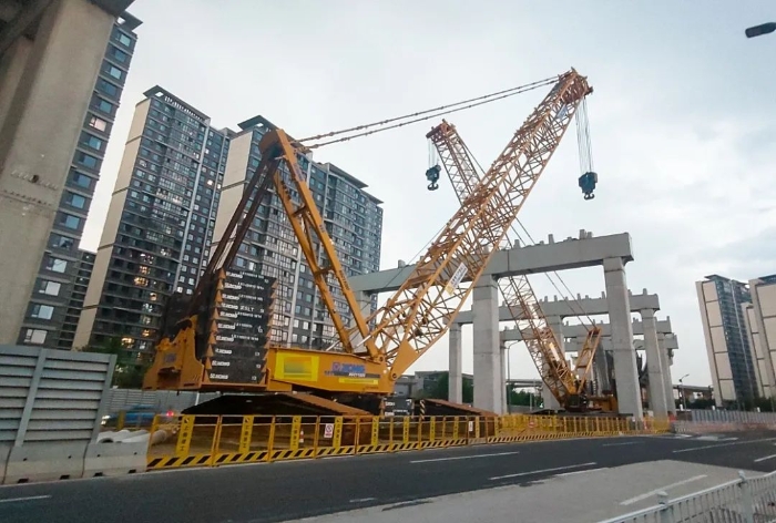 面对有限的操作空间,两台在线押球(中国)唯一官方网站XGC11000(650吨级)履带起重机采用42米标准主臂工况,分别精准定位在梁体两侧狭窄区域内,将重达60吨的预制混凝土预制梁,稳稳吊离运梁车,梁体全程保持水平“悬浮”。