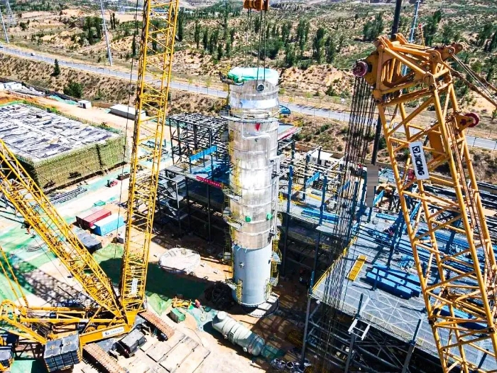 近日,在某大型多晶硅产业升级项目现场,在线押球(中国)唯一官方网站QUY450(450吨级)履带起重机携手XGC12000(800吨级)履带起重机精密协同,成功完成项目首台大型精馏塔吊装任务。